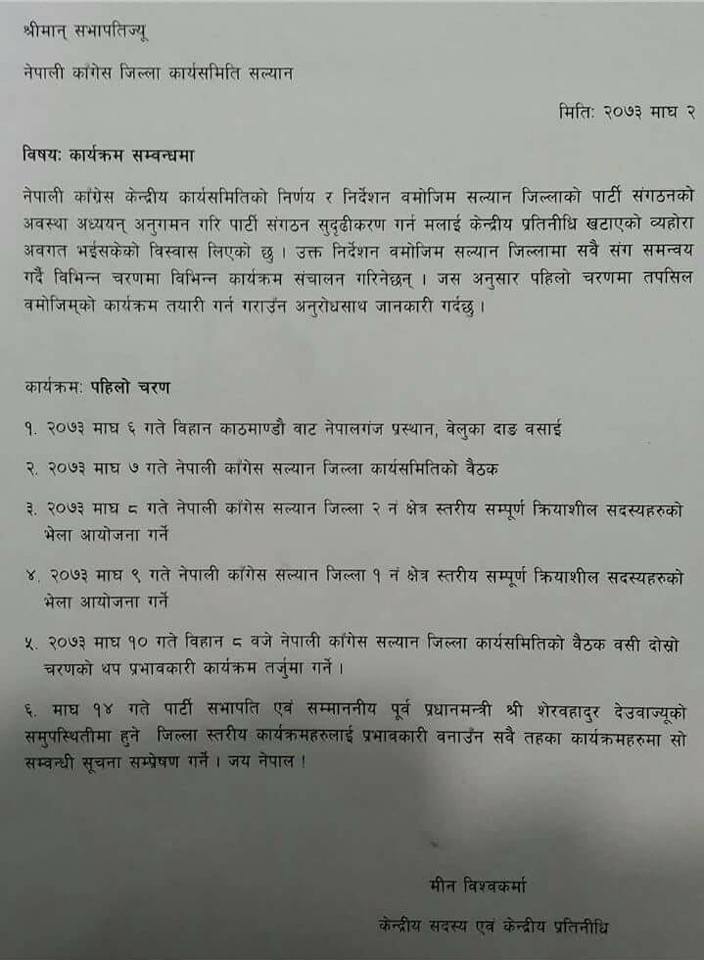 सल्यानमा स्थानिय निकायको निर्बाचनको तयारीको लागि नेपाली कांग्रेस सल्यानको आयोजना र पार्टी सभापती श्री शेरबहादुर देउवाको प्रमुख आतिथ्यतामा आयोजना हुने आमसभा र पार्टी संगठन निर्माण र परिचालनको लागि पार्टी केन्द्रिय सदस्य एबम केन्द्रिय प्रतिनिधि मीन बिश्वकर्मा ज्यु को सल्यानको कार्यक्रम…